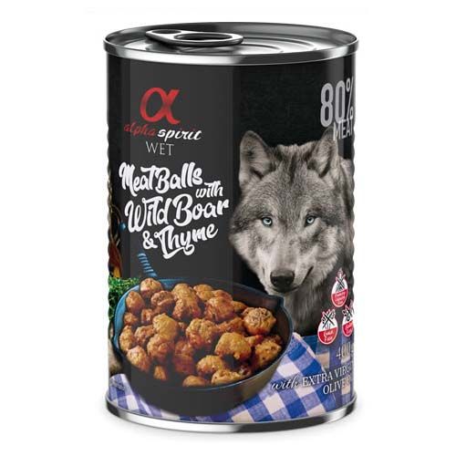 Alpha Spirit Gehaktballetjes van wild zwijn met tijm is een compleet natvoer, gepresenteerd in gehaktballen voor volwassen honden van alle rassen die is bereid met hoogwaardige ingrediënten verrijkt met tijm.