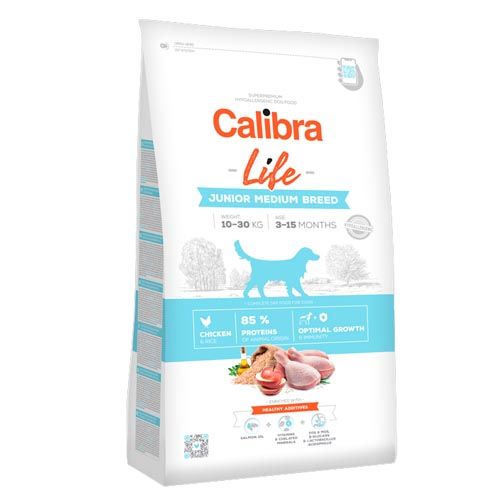 Calibra Dog Junior Medium Breed Kip is een volledige en hypoallergene voeding voor puppy´s en jonge honden (3 tot 15 maanden) van middelgrote rassen (10 tot 30 kg op volwassen leeftijd).