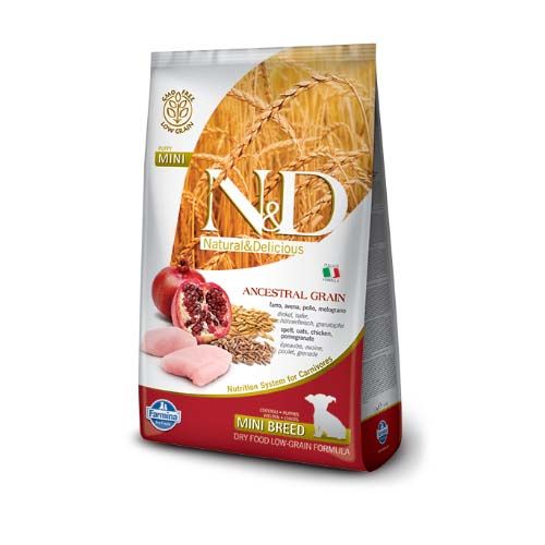 Farmina N&D Ancestral Grain Puppy Mini droogvoeding met kip, spelt, haver en granaatappel is een complete voeding voor puppy´s en drachtige of zogende honden.