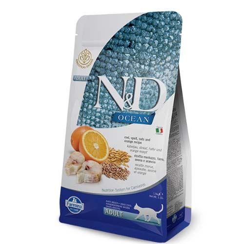 Farmina N&D Ocean ADULT droogvoer met kabeljauw, spelt, haver en sinaasappel is een complete voeding voor volwassen katten.