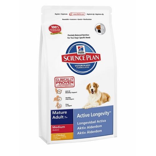 Hill´s Canine Longevity ChickenHill´s™ Science Plan™ Canine Mature Adult 7+ Active Longevity Medium met Kip is samengesteld voor het behoud van mobiliteit en gezonde vitale organen. Bevat antioxidanten en glucosamine en chondroïtine uit natuurlijke bronnen.Belangrijkste voordelenGlucosamineen chondroïtinesulfaat uit natuurlijke bronnen helpen de mobiliteit en gezonde gewrichten te behouden.Uitgebalanceerde niveaus van natrium en fosfor om gezonde vitale organen te behouden.Zeer goed verteerbare ingrediënten voor een optimale opname van voedingsstoffen.Gemaakt met ingrediënten van hoge kwaliteit voor een heerlijke smaak. 100% gegarandeerd.