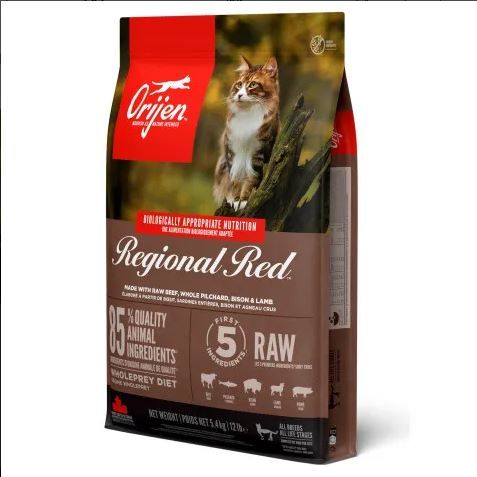 Orijen Regional red cat is graanvrij voer met vers vlees dat voldoet aan de behoeften van een natuurlijk kattendieet.