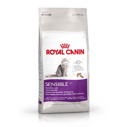 Royal Canin Cat Sensible 33 is een uitgebalanceerde volledige voeding voor volwassen katten, ouder dan 1 jaar, geschikt voor katten met spijsverteringsgevoeligheden, speciaal samengesteld om de spijsvertering te bevorderen door zorgvuldig geselecteerde bronnen van eiwitten en koolhydraten.