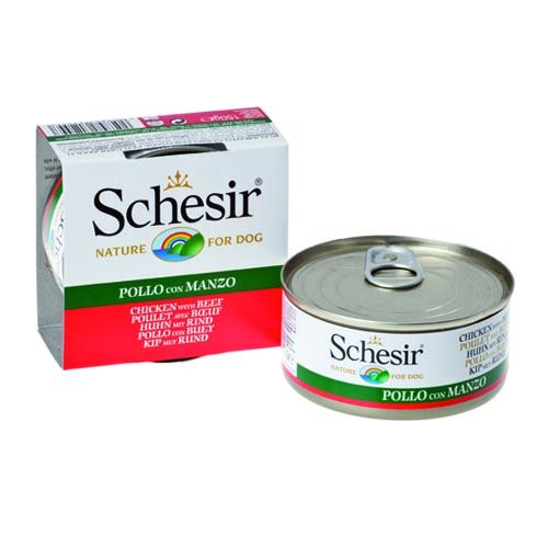 Schesir Dog Chicken & Beef in Jelly natvoer in blik, perfect voor alle soorten honden, gemaakt met 58% kippenvlees en een deel rundvlees. Gemaakt van 100% natuurlijke ingrediënten. Het bevat geen conserveringsmiddelen, kleurstoffen, additieven of smaakversterkers.